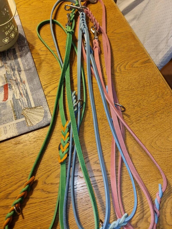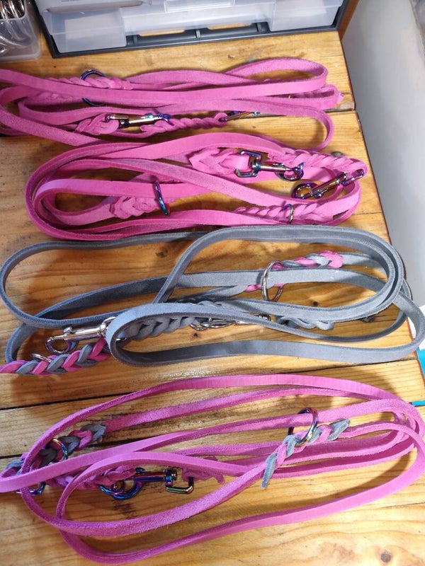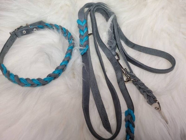 Ein zauberhaftes Set aus Halsband und Leine. Die Leine ist 3 fach verstellbar und ca. 2,50 m lang, das Halsband geflochten, die Beschläge sind aus Chrom.